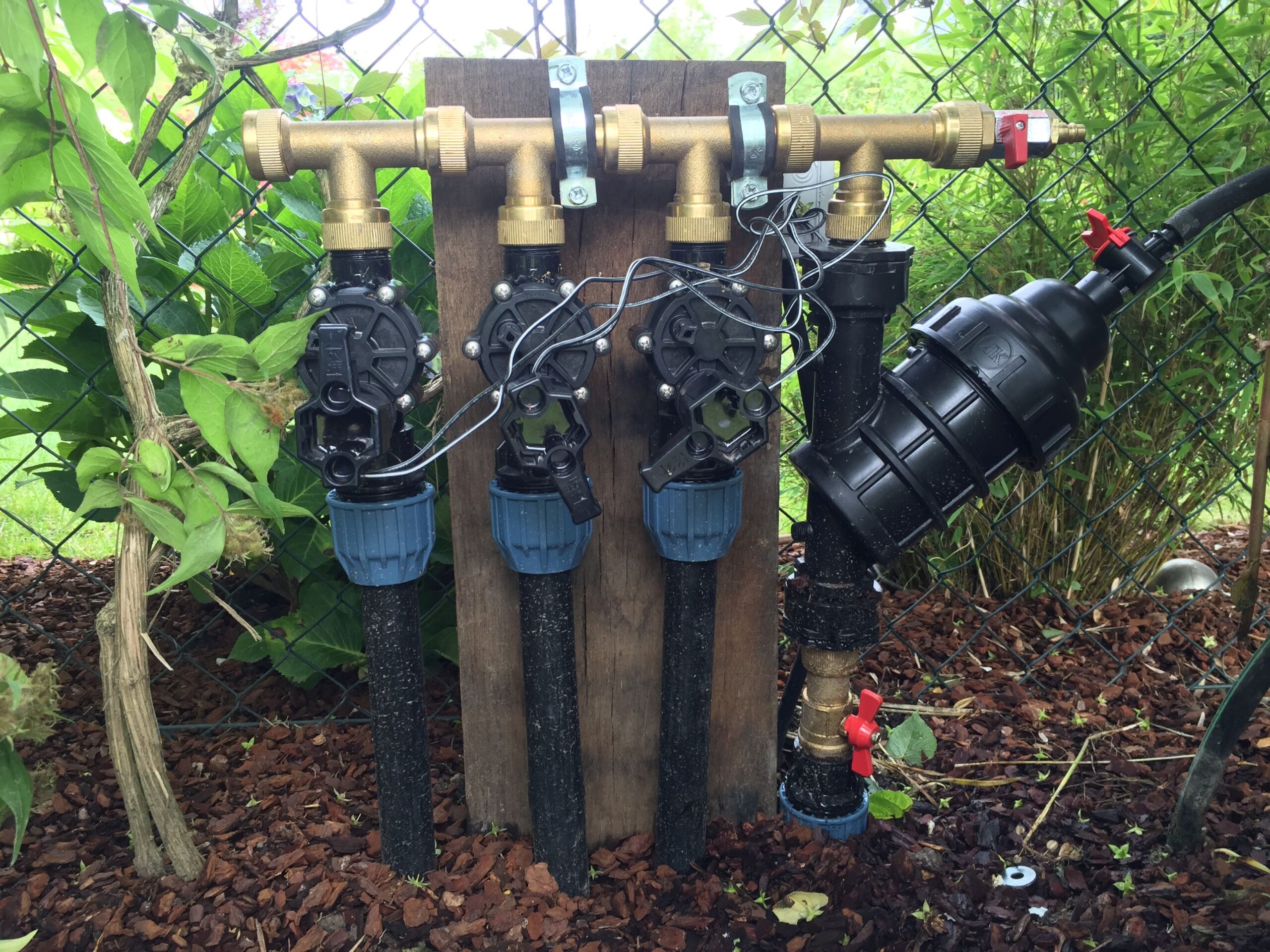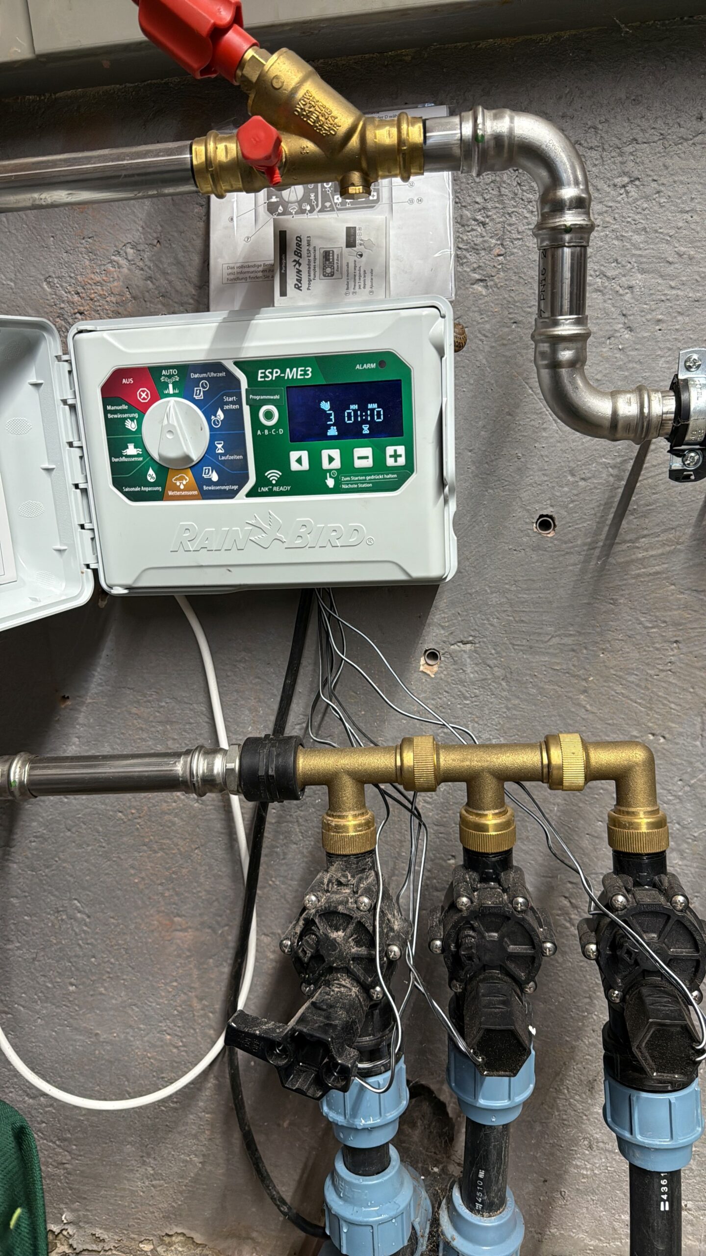 Natürlich ist auch ein Regensensor angeschlossen, der bei genügend Regen die Anlage pausieren lässt. Wie bereits erwähnt, kann die komplette Bewässerung vom Handy aus gesteuert werden.